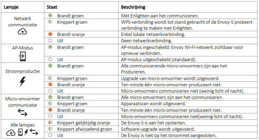De gateway is het bakje dat in je meterkast hangt, hier zijn 4 lampjes op, zie hieronder voor de betekenis. Bij een normale werking heb je 2 of 3 groene lampjes.